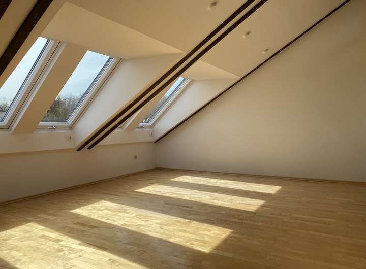 Das Dachgeschoss bietet ein geräumiges, lichtdurchflutetes Schlafzimmer mit zwei großen Dachflächenfenstern, eine kleine Galerie mit gemütlichem Rückzugsbereich sowie ein weiteres Badezimmer.
