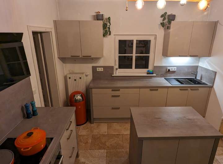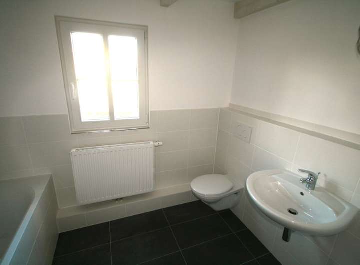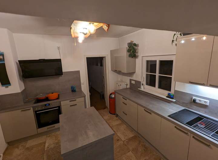 Im Erdgeschoß befinden sich drei Zimmer (Eichenparkett), die Küche (Steinboden) und ein kleines Bad (Dusche/WC), sowie ein Abstell/ Technikraum. Die Einbauküche kann vom Vormieter abgelöst werden.