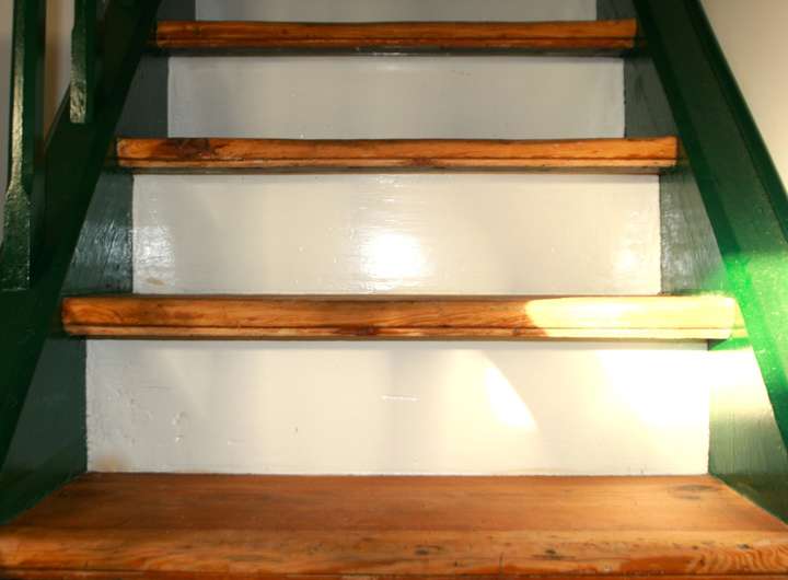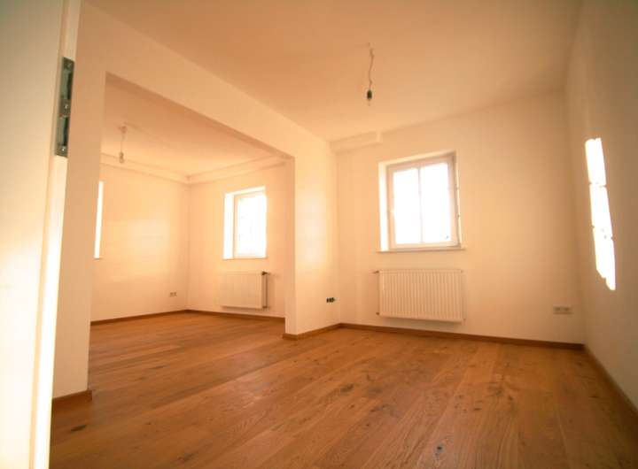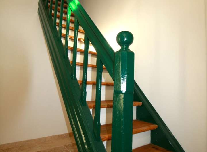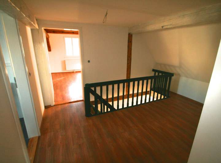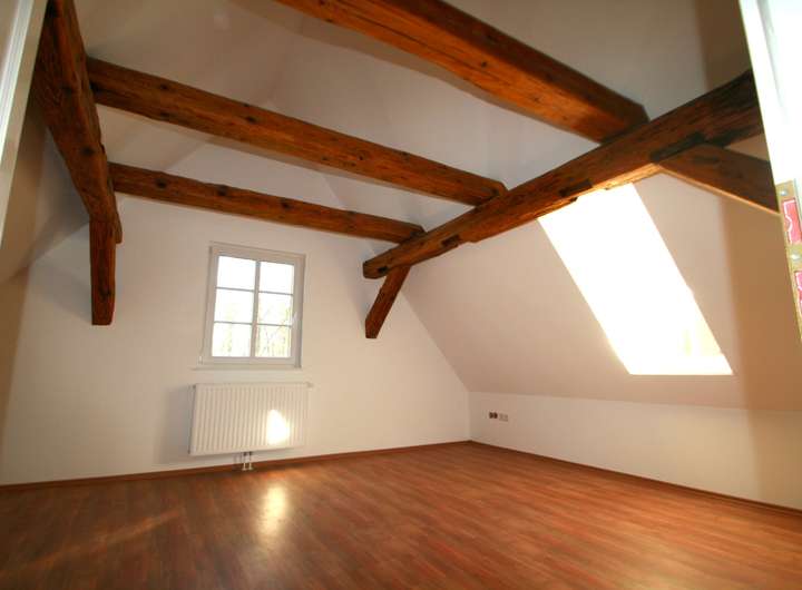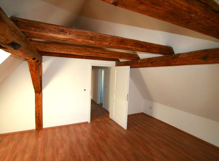 Eines der beiden oberen Zimmer ist bis zur Dachspitze ausgebaut und hat eine Erweiterung in den Dachboden zu einer Seite hin. Im oberen Geschoß spiegeln freigelegte Holzbalken den historischen Charakter des Anwesens wieder.