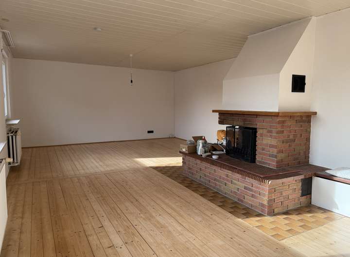 * ein sehr großes, helles Wohnzimmer mit Echtholzdielen und offenem Kamin