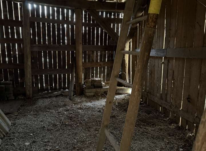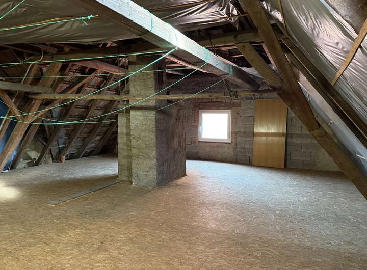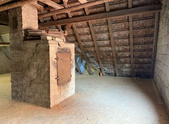 * rechts ein großer Dachboden mit Räucherofen (Fußbodendämmung)