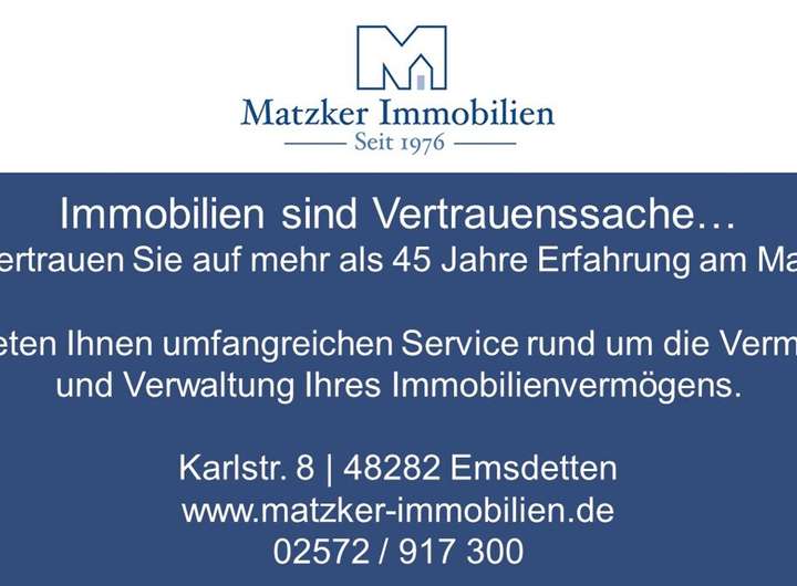 In stadtnaher und ruhiger Wohnlage von Emsdetten, an der Weststr. 49, liegt die Wohnung. Die Innenstadt mit allen Geschäften, Ärzte und Apotkeken, sowie der Bahnhof sind fußläufig gut erreichbar.