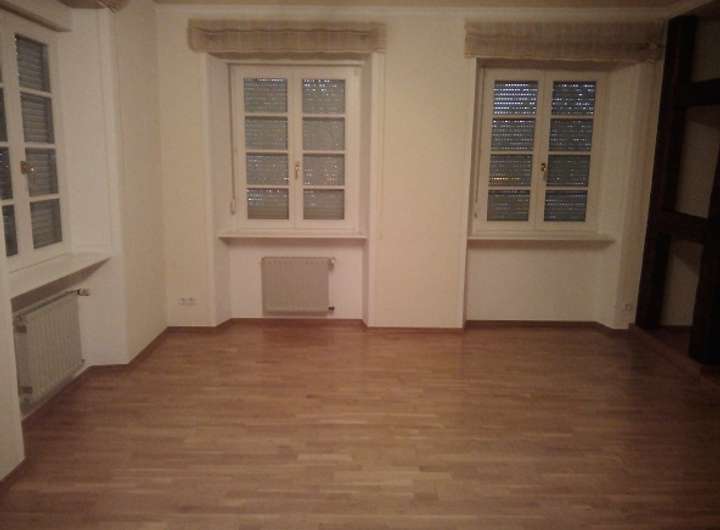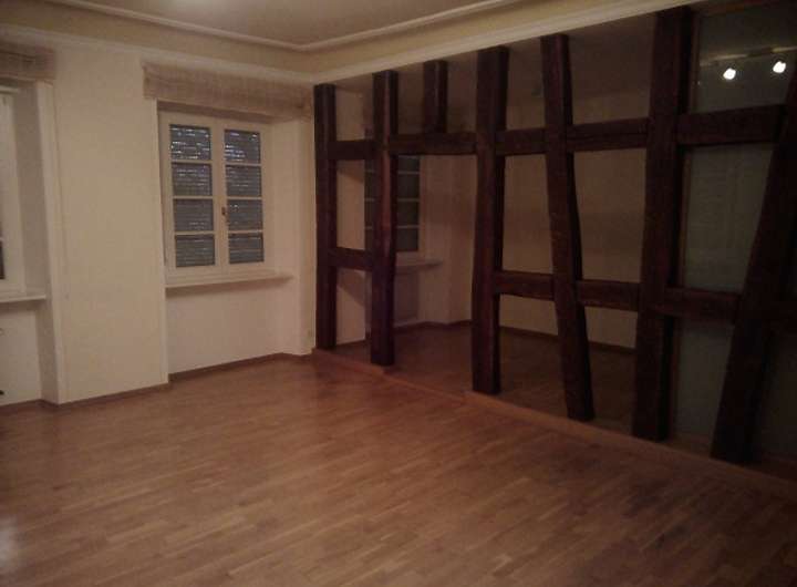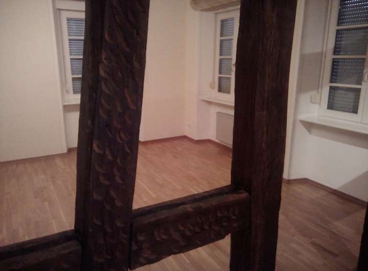 Eine Küche, das große Wohnzimmer mit vielen historischen Fenstern, die Balkenabtrennung zum Schlafbereich und das moderne Badezimmer garantieren ein angenehmes Wohnen.