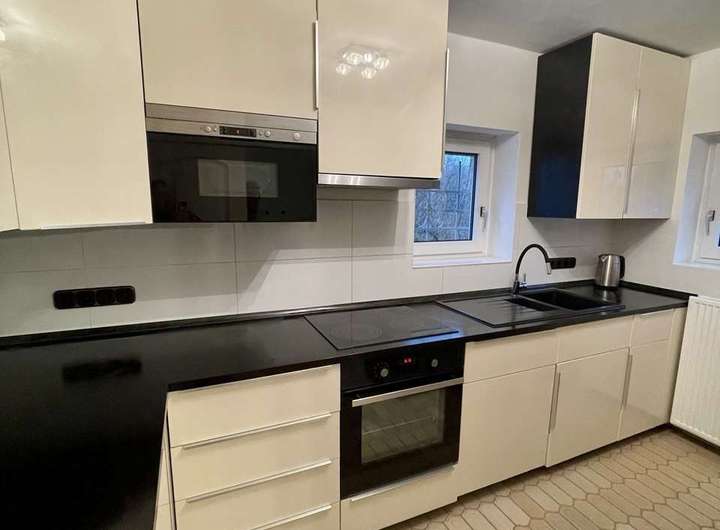 • Moderne Einbauküche mit Spülmaschine, Backofen und Mikrowelle