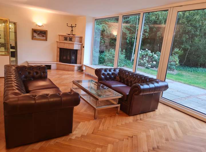 Beide Wohnzimmer bieten einen schönen Ausblick auf den gepflegten Garten - besonders das gemütliche Kaminzimmer, von dem aus Sie direkt auf die Terrasse und in den Garten gelangen. Ideal für entspannte Sommerabende oder gesellige Treffen mit Freunden.