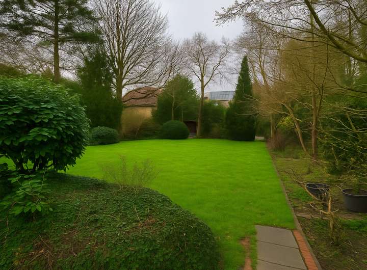 Die großzügige Terrasse und der sonnige Balkon laden zum Verweilen ein, während der weitläufige Garten mit altem Baumbestand Privatsphäre und Naturerlebnis bietet.
