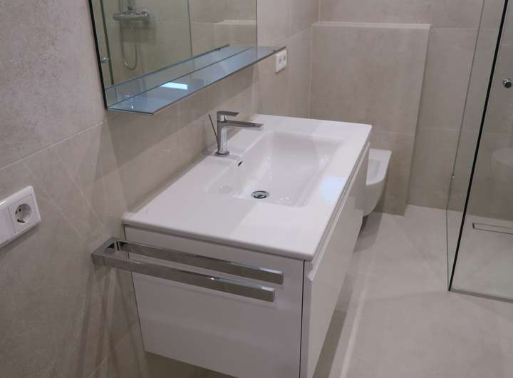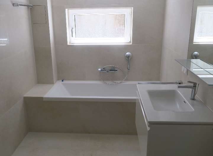 - Großformatige italienische Feinsteinzeug-Fliesen im Wohn-Essbereich, Küche und Bädern.