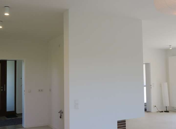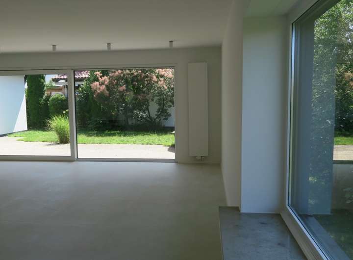 Ein heller Eingangsbereich mit bodentiefen Fensterfronten trennt Wohn- und Schlafbereich und führt direkt in den Garten. Der große Wohn-Essbereich mit offener Küche bietet einen herrlichen Blick auf die überdachte Terrasse und den nicht einsehbaren Südgarten. Es ist keine Küche eingebaut. Das EG und UG verfügen beide über ein Bad mit Dusche oder Badewanne. Zudem befindet sich im UG neben einem großzügigen Hobbyraum mit Tageslicht ein Technikraum mit Anschluss für Waschmaschine und Trockner sowie ein separater Kellerraum.