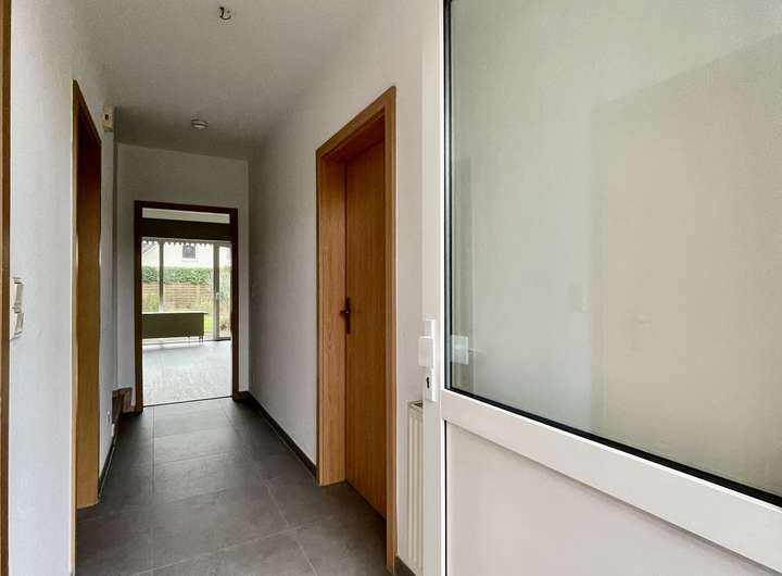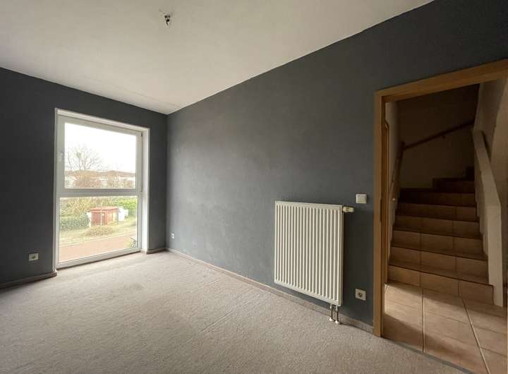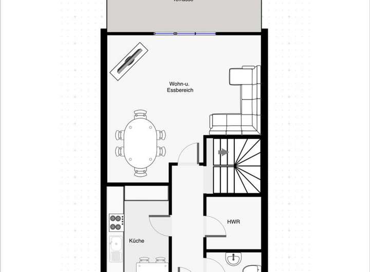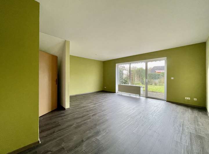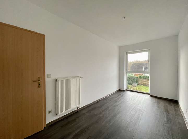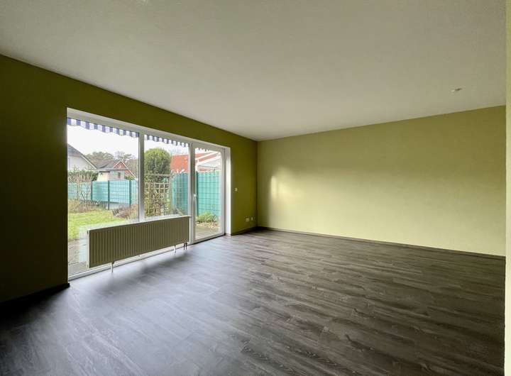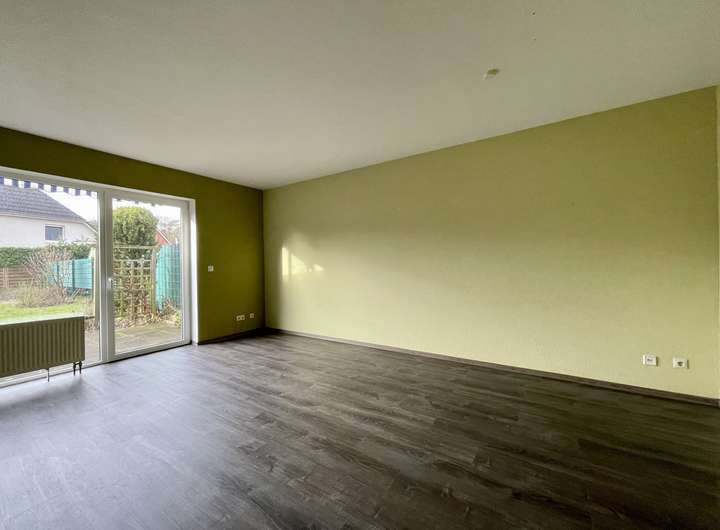 Das Reihenmittelhaus bietet im Erdgeschoss ein großzügiges Wohnzimmer mit dem direkten Zugang zu der Terrasse mit Garten, eine Küche, einen Abstellraum und ein Gäste-WC mit einem Fenster.