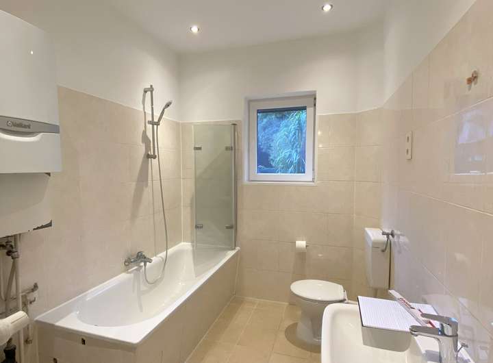 Das Badezimmer ist mit einer Badewanne, einem Fenster sowie einem Waschmaschinenanschluss ausgestattet. Hier befindet sich außerdem die Gastherme.