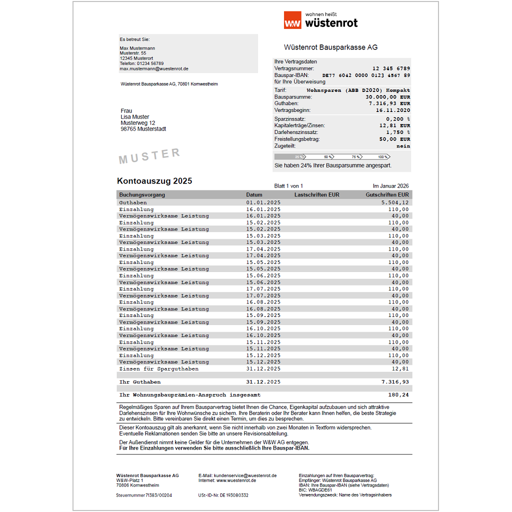 Jeder Vertrag hat ein Bausparkonto und damit eine eigene Bauspar-IBAN. Geben Sie diese bei Überweisungen an. Empfänger ist die Wüstenrot Bausparkasse AG.
